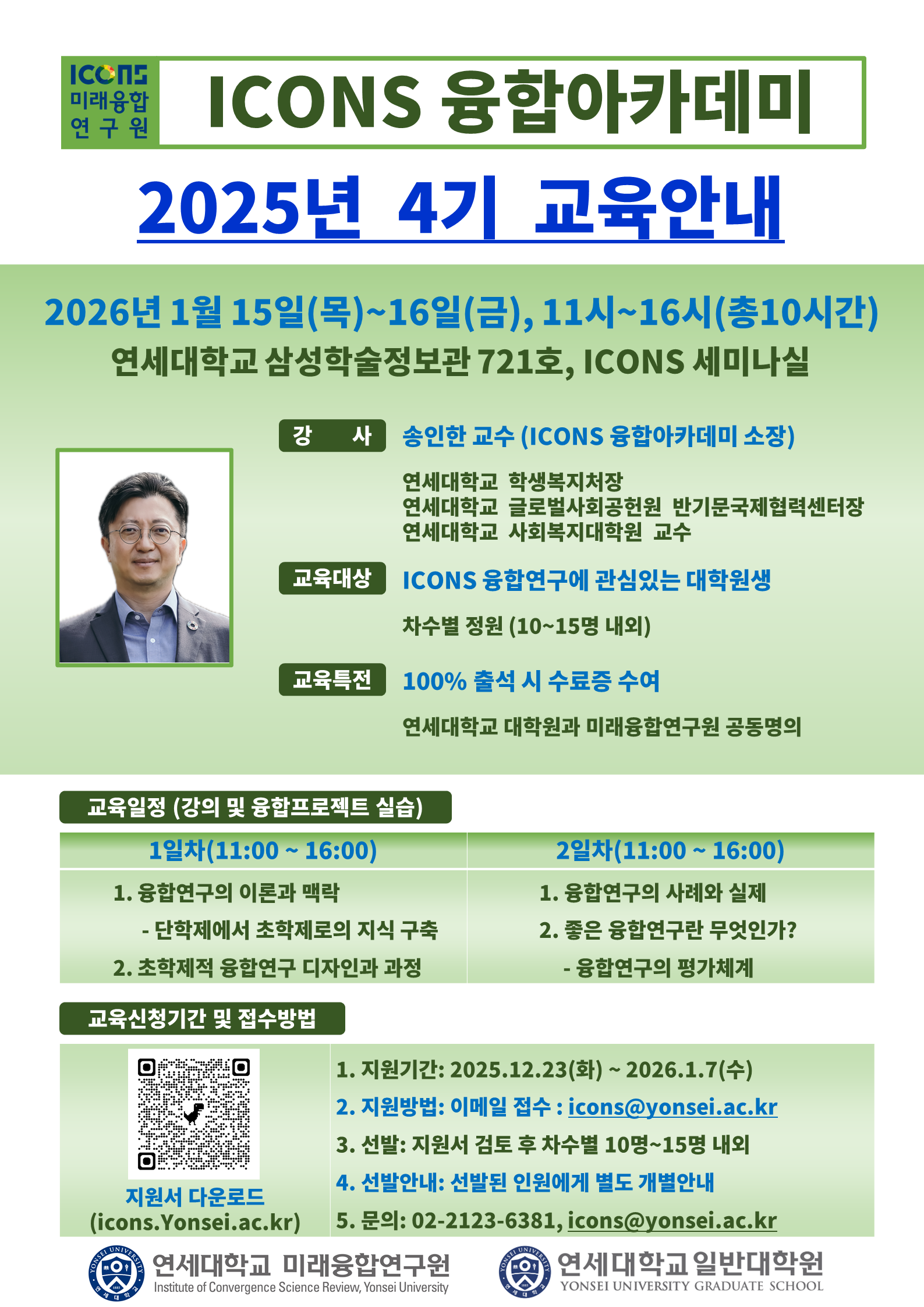 미래융합연구원에서는 2025 하반기 ICONS 융합아카데미 과정을 운영하오니융합연구에 관심 있는 학생들의 많은 관심과 참여 부탁드립니다.교육 수강을 원하는 분들은 등록 전, 반드시 안내 사항을 필독해주시기 바랍니다.※ 등록방법- 해당 게시글에서 교육신청서를 다운로드 받아 작성 후, 이메일(icons@yonsei.ac.kr) 제출** 소규모로 진행되오니 반드시 교육 전체 수강이 가능하신 분만 접수하시기 바랍니다.**------------------------------------------------------------------------------------------2025 하반기 ICONS 융합아카데미 4기 교육안내1. 강사- 송인한 교수(ICONS 융합아카데미 소장)2. 교육기간 (총 2일)- 4기 : 2026년 1월 15일(목)~ 16일(금), 11시~16시 (총 10시간)* 교육 중간에 점심시간 30분 배정, 다과 및 식사가 제공됩니다.3. 교육장소- 연세대학교 삼성학술정보관 721호 ICONS 세미나룸4. 교육대상- ICONS 융합연구에 관심있는 연세대학교 소속 대학원생 (차수별 정원 15명)5. 교육일정- 1일차1. 융합연구의 이론과 맥락: 단학제에서 초학제로의 지식 구축2. 초학제적 융합연구 디자인과 과정- 2일차1. 융합연구의 사례와 실제2. 좋은 융합연구란 무엇인가?초학제적 융합연구 디자인과 과정: 융합연구의 평가체계